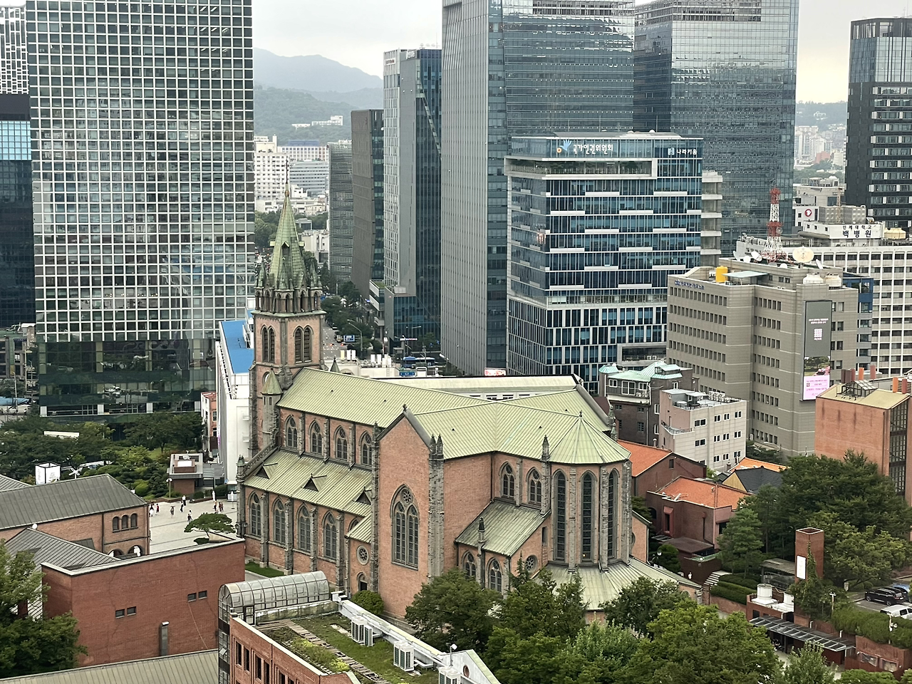 마지막 날의 일정은 한 줄짜리입니다. 숙소에 머무는 동안 창문으로 바라보기만 했던 명동대성당에 갈 것입니다. '성당 뷰'로 예약한 호텔의 방은 운이 좋게 제일 꼭대기층인 20층으로 배정을 받았지요. 매일 아침 커튼을 열 때마다 설레게 하던 그 뷰로 걸어 들어가 봅니다. 명동성당에서는 월~토요일 10시에 성지 미사가 봉헌됩니다. 그래서 성당 가는 길에 있는 뚜레쥬르에서 샌드위치와 커피를 마시고 여유롭게 명동성당에 도착했습니다. 앞자리에 앉았더니 미사가 끝난 뒤, 매일 미사를 드리는 (것 같은) 할머니들께서 아이들에게 예쁘다며 한 마디씩 하셨습니다. 한 분은 처음 만난 사이지만 가방에서 선물도 꺼내 주셨지요. 이 세상은 혼자 살아가는 것이 아님을 다시 느꼈답니다. 가슴에 새겨두고 자주 꺼내보는 마음, 하루를 감사한 마음으로 마무리할 수 있는 것은 내가 잘나서가 아니라 나를 채워준 사람들 덕분, 이라는 것을 다시 깨달았지요.