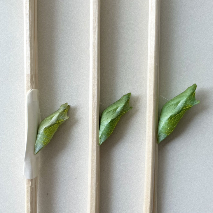 놀라운 한 장면, 번데기가 되는 과정은 늘 신비롭습니다. 배추흰나비 애벌레 몇 십 마리를 키웠던 어느 해에는 먹이 식물인 케일이 자라는 속도가 애벌레들의 먹성을 따라잡을 수 없었던 해였지요. 그래서 5령 애벌레들의 먹이를 이틀 동안 중단하는 큰 결심을 한 적이 있어요. 배가 고파 죽으면 어떡하지 걱정은 되었지만 이제껏 애지중지 키운 애벌레들에게 마트에 파는 잎을 먹일 수는 없었으니까요. 그때는 꼬물꼬물 기어서 먹이를 찾으러 다니는 애벌레를 보며 '살 빠질라 그만 돌아다녀'라고 말하고 싶었지요.