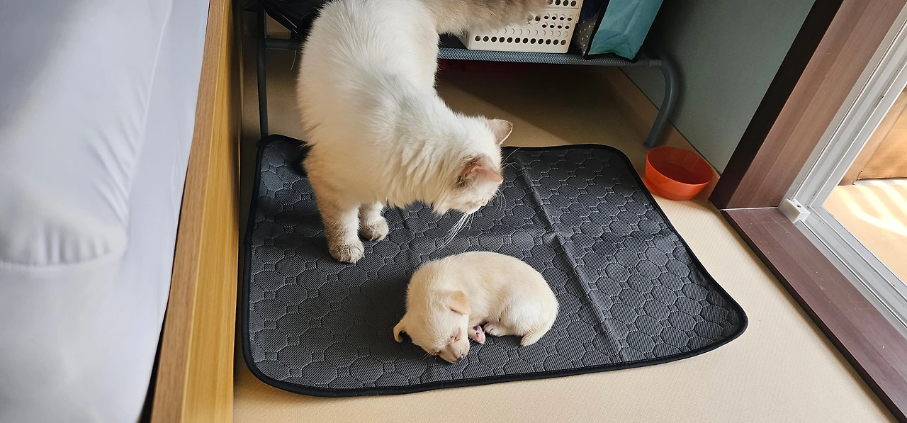 "이 집서 편히 살고 싶으면 하루빨리 똥오줌 가려서 싸고, 주는 사료 잘 먹고 낮에는 잘 놀고 주인 식구들 잘 때는 너도 허튼짓 말고 처박혀 조용히 자야 한다. 그리고 거실 구석에 있는 자동 급식기에서 나오는 사료는 이 오빠 밥이니까 근처에 얼씬도 말고. 내가 귀가 좀 예민하니까 내 잘 때는 조용히 다니고. 알겠지. 캬~악 퉤옹~."