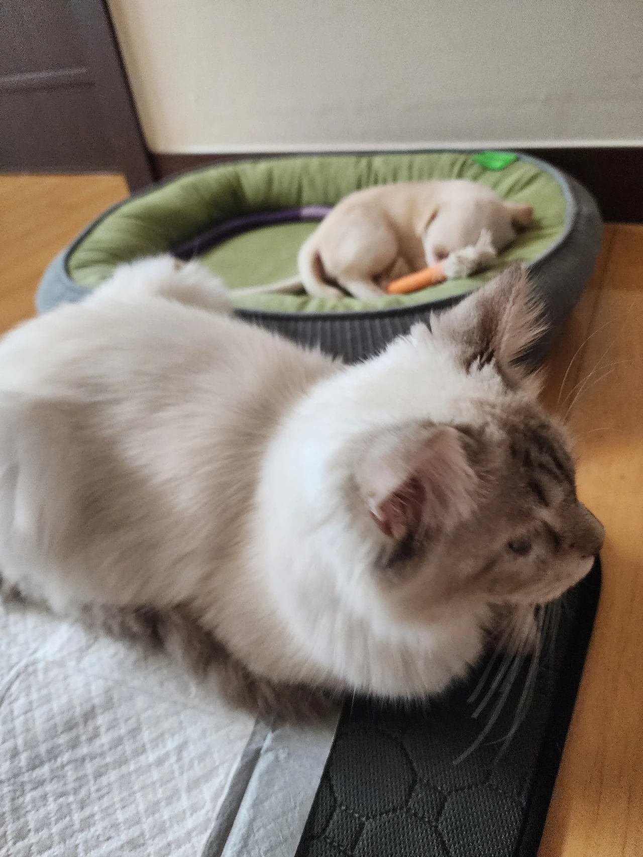 쥐새끼 만한 것이 내 펀치 한방이면 저~짝으로 나가떨어질 것 같은 똥개가 낯설고 무서운지 바들바들 떨고 있는 꼴이라니. 참 꼴 사납구나. 슬쩍 다가가 내 주먹으로 톡톡 건드리니 고개를 돌리고 구석으로 숨고 있네. 한주먹 거리도 안 되는 녀석이구나. 이놈아 눈 깔어라. 앞으로 내 눈에 거슬리면 재미없을 줄 알아라. 한 껏 털을 세우고 겁을 주니 낑낑대며 더 구석으로 숨는다. 자세히 보니 암놈이로구나. "오빠라고 불러라. 아.. 오빠가 아닌가." 아무튼 그냥 오빠라 부르고 나로 말할 것 같으면 이름은 크림이고 이 집에는 한 달 반 전에 왔으니 내가 너 보다 한참 고참이렸다.