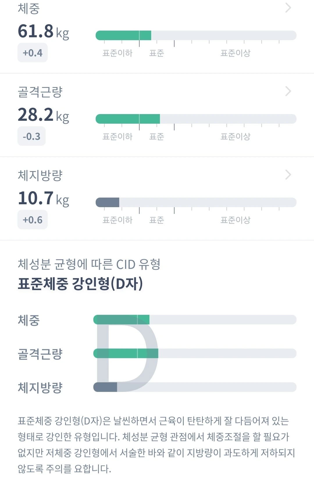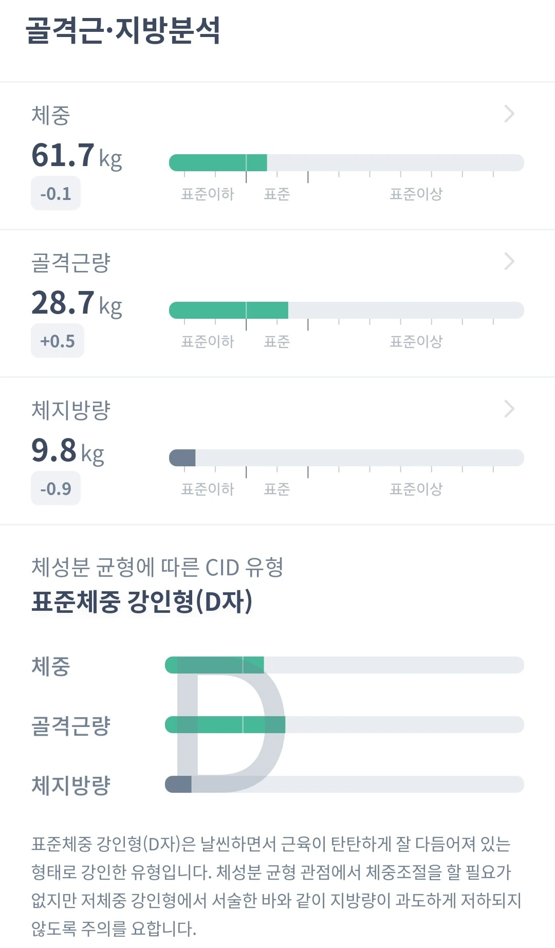 근육량은 0.5kg 증가했다. 목표량은 30kg인데, 역시 근육 증량은 쉽지 않구나.