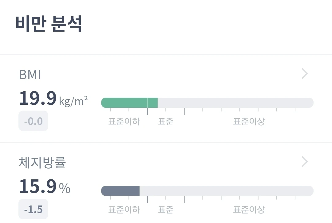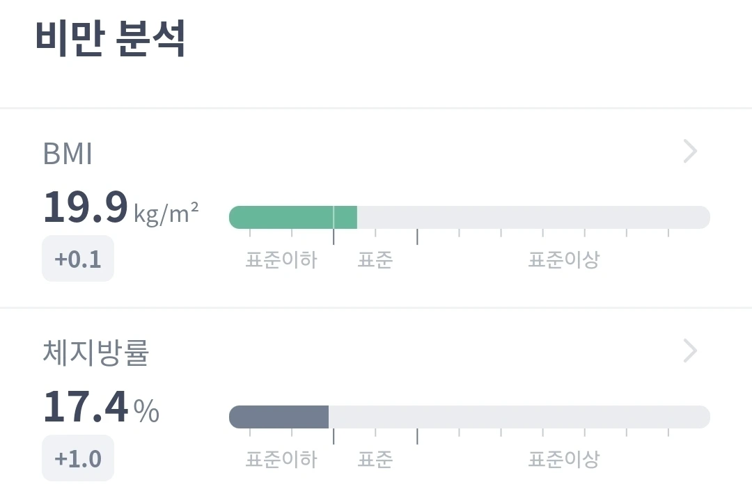 그래도 저번과 비교했을 때 체지방량이 거의 1kg 빠지고 체지방률도 1.5% 줄어서 목표치인 16% 이하에 도달한 것을 볼 수 있었다.