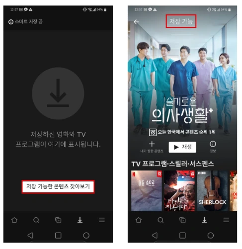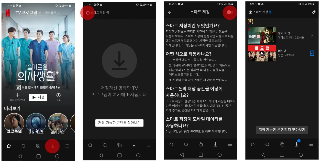 스마트 저장은 오프라인 모드에서 시청하는 유저에게 좋은 기능이다. 스마트 저장 기능은 '끔'이 디폴트로 설정되어 있다. 저장한 콘텐츠 목록 탭에서 왼쪽 상단에 '스마트 저장'을 누르면 바로 켬 상태로 바뀌는 대신 스마트 저장 기능에 관한 설명 페이지가 보인다. 이는 처음 넷플릭스를 이용하는 유저에게 스마트 저장 기능이 생소할 수 있기 때문에 유의사항을 안내하기 위해 보여주는 것으로 추측된다.