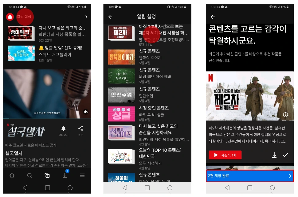 넷플릭스가 얼마나 시청하기에 집착하는지 알 수 있는 대목이다. 알림 설정 페이지에는 하단 네비게이션 바가 없어 저장 여부를 확인할 수 없다. 특정 알림글을 확인하고 다시 피드로 돌아오기까지 두 단계를 거쳐야 하는데, 이를 한 단계로 줄였다. 알림글 내에서 저장한 콘텐츠 목록으로 이동하는 팝업을 제공하고 있다. 앱 내 어디서든 바로 시청하기로 들어갈 수 있게 마련한 것이다. 유저에게는 여러 경로를 이동하지 않고도 원하는 목표(시청)로 향할 수 있어 편리하다.