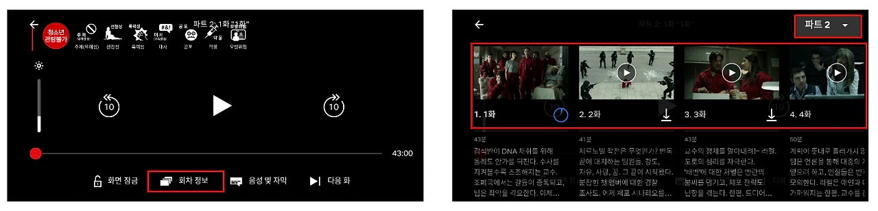 회차가 여러 개인 경우 하단에 '회차 정보'가 보인다. 회차 정보 페이지에는 시즌별로 1화부터 마지막화까지 보이며 다운로드도 가능하다. 줄거리 흐름상 1화부터 순차적으로 봐야 하는 드라마를 볼 때는 유용하진 않지만 예능과 같이 회차와 상관없이 볼 때는 시청 중간에 원하는 회차로 넘어갈 수 있어 유용하다.