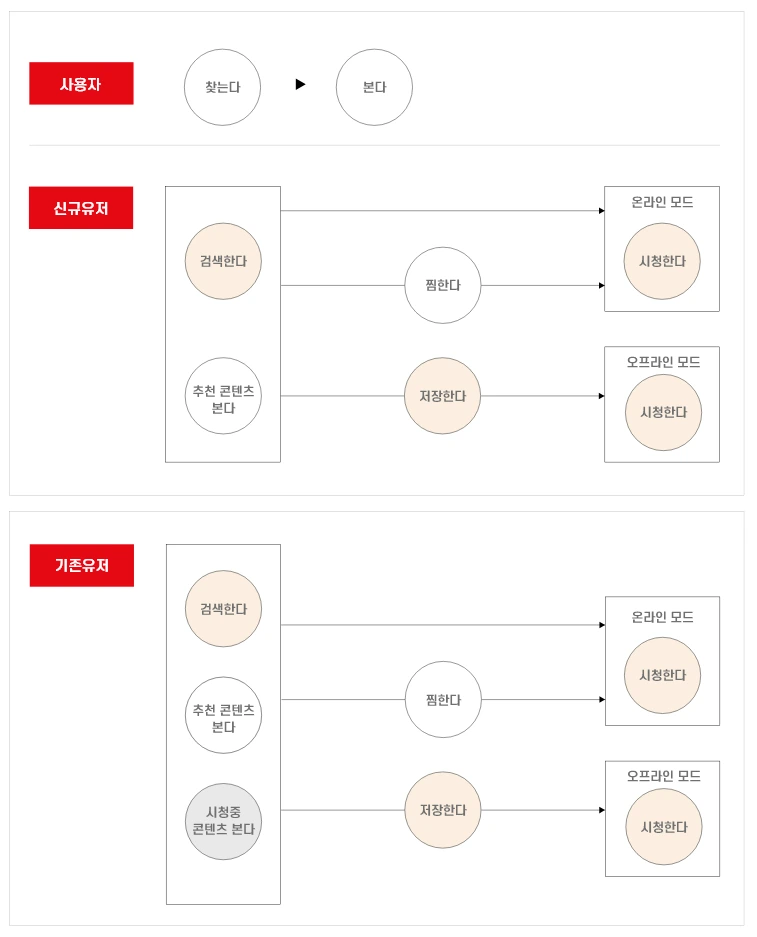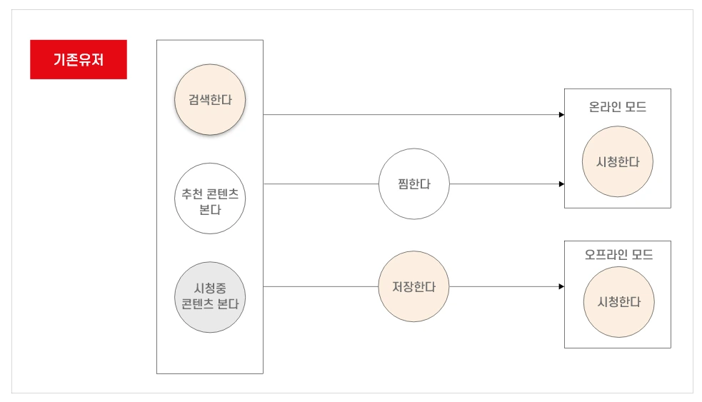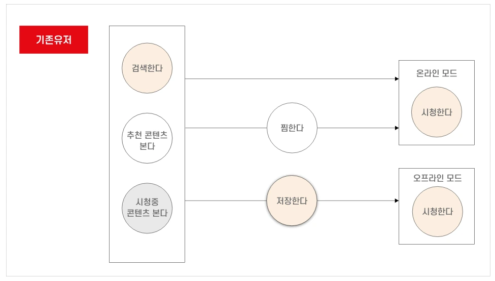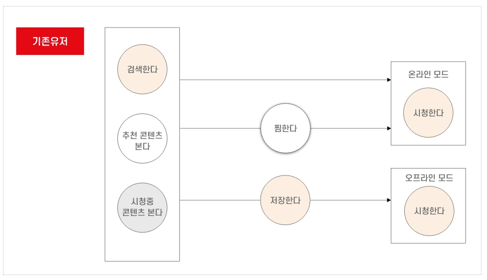 기존 유저는 검색과 추천콘텐츠 외에도 현재 시청 중인 콘텐츠를 바로 보거나 그전에 찜하기 해둔 콘텐츠를 찾는 활동을 한다. 원하는 콘텐츠를 찾았다면 바로 시청하거나, 찜한 후에 나중에 보거나, 저장한 뒤 오프라인 모드에서 시청한다. 각 단계에 좋은 사용경험을 주는 요소는 연주황색을, 나쁜 사용자경험을 주는 요소는 연회색으로 표시했다.