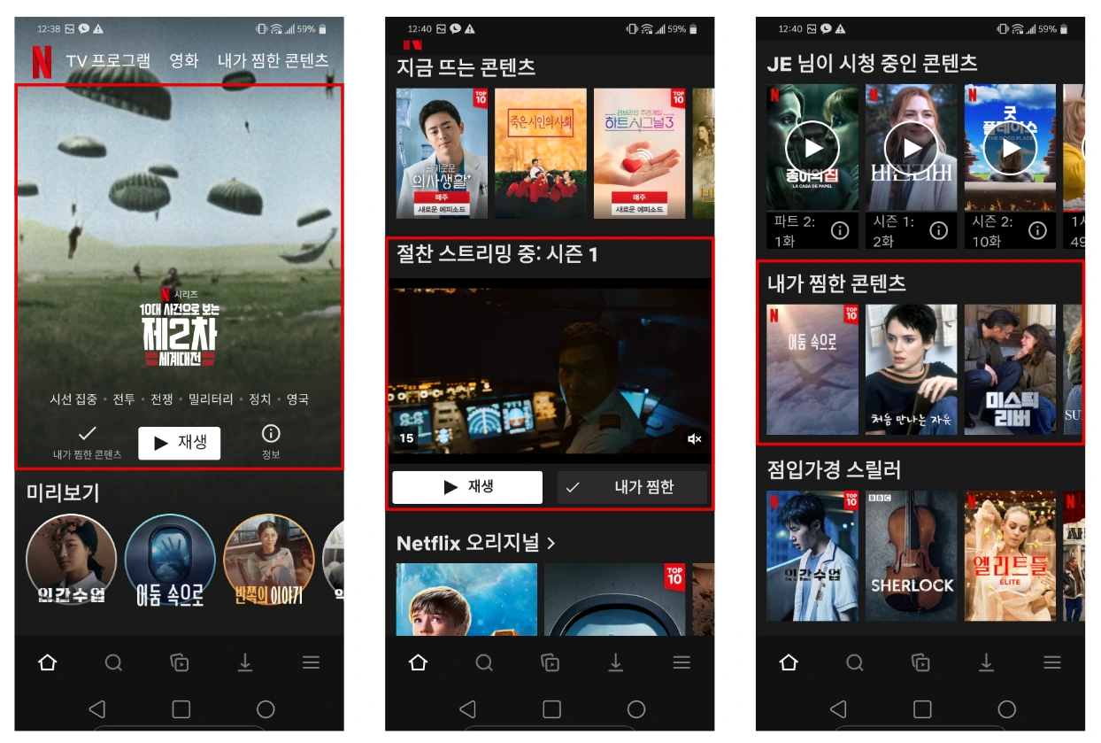 내가 찜한 콘텐츠 목록 이동 Flow넷플릭스는 찜하기를 하고 잊힌 콘텐츠를 여러 방식으로 유저에게 다시 인식시킨다. 앞서 말한 개인화된 홈화면 정렬방식은 물론, 미리보기, 절찬 스트리밍 중 등의 영역에 이전에 찜한 콘텐츠를 보여주고 있다. 유저는 홈화면에서 콘텐츠를 탐색하는 중에 '내가 찜한'으로 체크한 것을 발견하고, 그 옆의 재생 버튼을 눌러 곧바로 영상에 진입할 수 있다. 이전에 찜했던 작품이기 때문에 낯선 작품을 선택할 때보다는 진입장벽이 낮아지는 것이다. 유저의 입장에서도 뭘 봐야 할지 고민될 때 깜빡 잊었던 작품을 다시 보고 수월하게 뭘 볼지 결정할 수 있다.