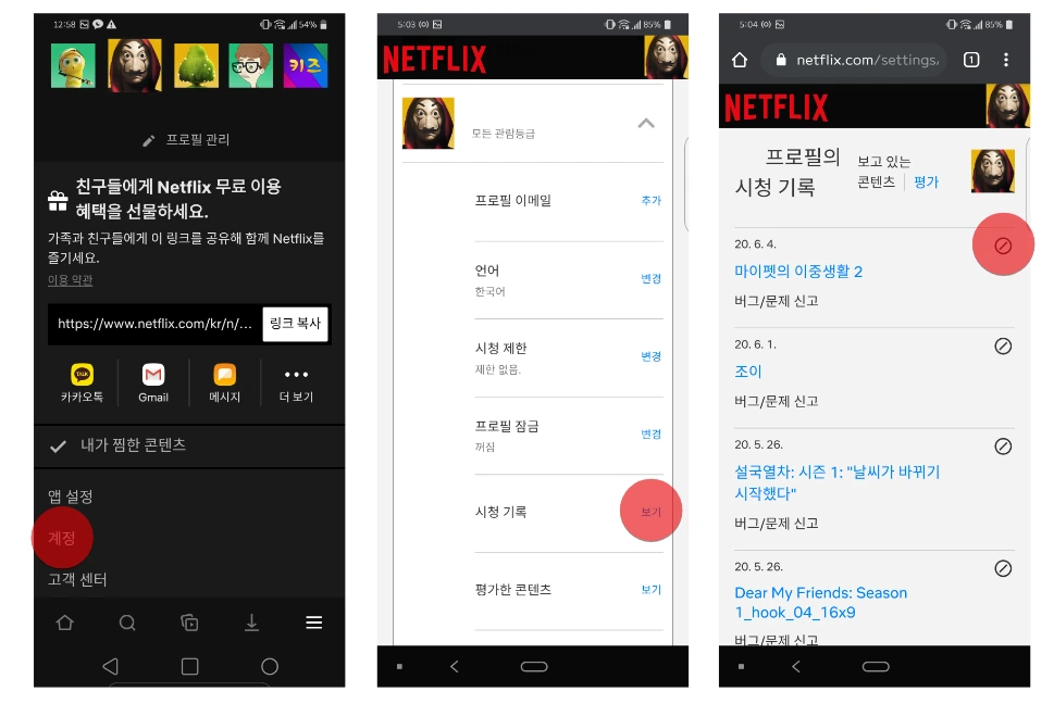 일반 프로필 내 저장한 콘텐츠 목록(좌)과 키즈 프로필 내 저장한 콘텐츠 목록(중, 우)