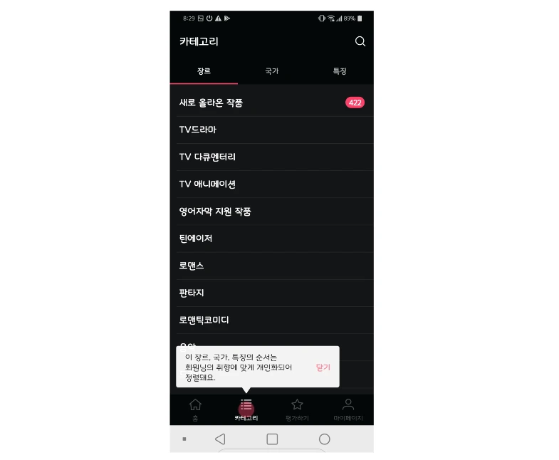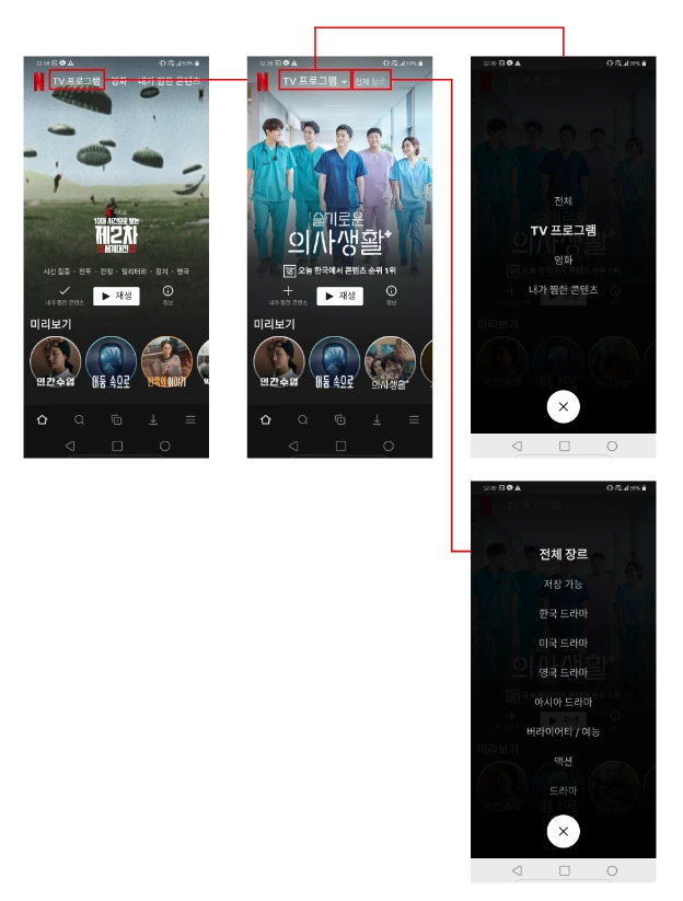 이번에 넷플릭스을 분석하지 않았더라면 결코 몰랐을 기능이 있다. 바로 홈화면 상단 탭이다. 이미지가 눈에 띄다보니 상대적으로 상단 탭에는 시선이 덜 가게 됐다. 그전까지는 장르를 찾는 방법을 몰랐는데, 상단탭을 누르면 TV프로그램, 영화 등에 세부적으로 장르를 필터링할 수 있다는 걸 알았다.