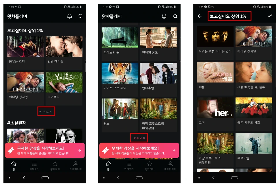 넷플릭스는 현재 홈화면 내 리스트는 좌우 스크롤만 제공하고 있다. 처음 1~3개 정도는 괜찮지만 카테고리 전체를 보기에는 불편했다. 왓챠 플레이의 경우 상하 스크롤에 맞춰 자연스럽게 콘텐츠를 볼 수 있게 했다. 가령 처음에 4개 콘텐츠를 보여준 후 유저가 '더보기' 버튼을 누르면 6개가 추가돼 총 10개 콘텐츠를 확인할 수 있다. 여기에 '모두보기' 버튼을 누르면 해당 카테고리 페이지로 이동하며, 총 180개 콘텐츠를 확인할 수 있다.