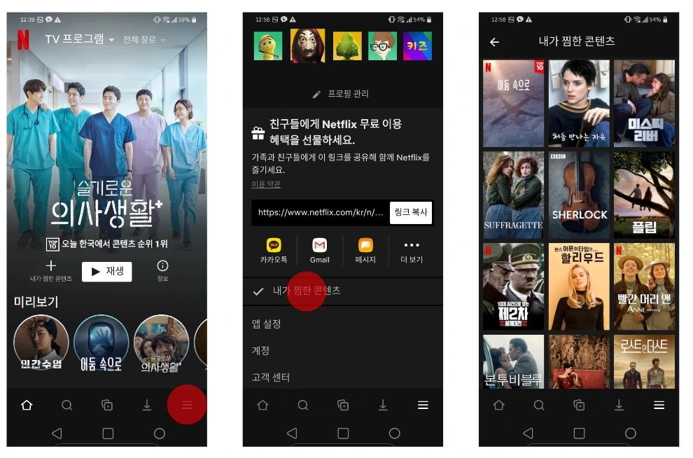 넷플릭스는 다양한 방식으로 찜하기 한 콘텐츠를 보도록 유도한다. 필자는 평소 '내가 찜한 콘텐츠'를 이용하기 위해 세 단계를 거친다. 먼저 사이드바 메뉴를 누르고, 무료 이용혜택 공유 하단에 '내가 찜한 콘텐츠'를 눌러 목록을 본다. 이렇게 원하는 페이지로 이동하기 귀찮다 보니 찜하기만 해 놓고 안보는 경우도 다수였다.