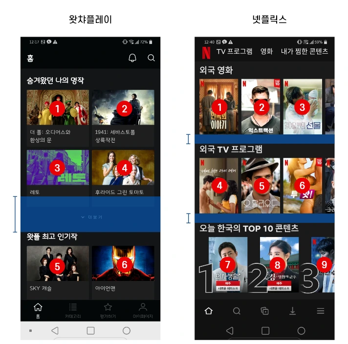 홈화면에 보이는 콘텐츠 개수 비교(왓챠플레이 VS 넷플릭스)