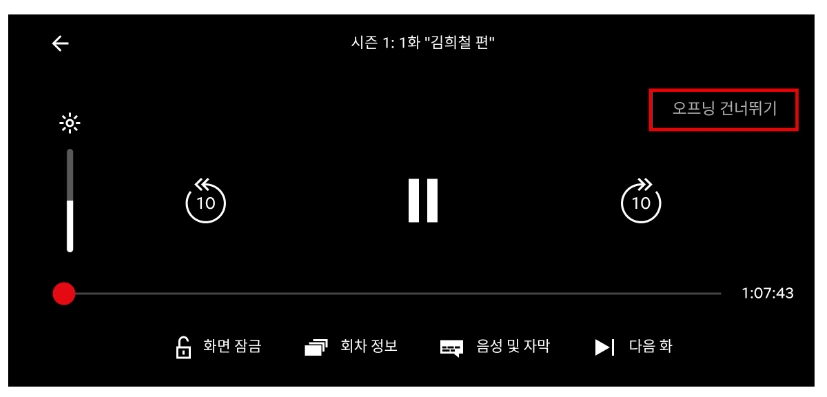 화면 잠금이 재생 컨트롤 화면이 보이지 않게 하는 것이기 때문에 '오프닝 건너뛰기' 버튼에 영향을 주지 않은 것으로 보인다. 덕분에 화면 잠금을 풀지 않고 바로 오프닝을 건너뛸 수 있어 편리했다.