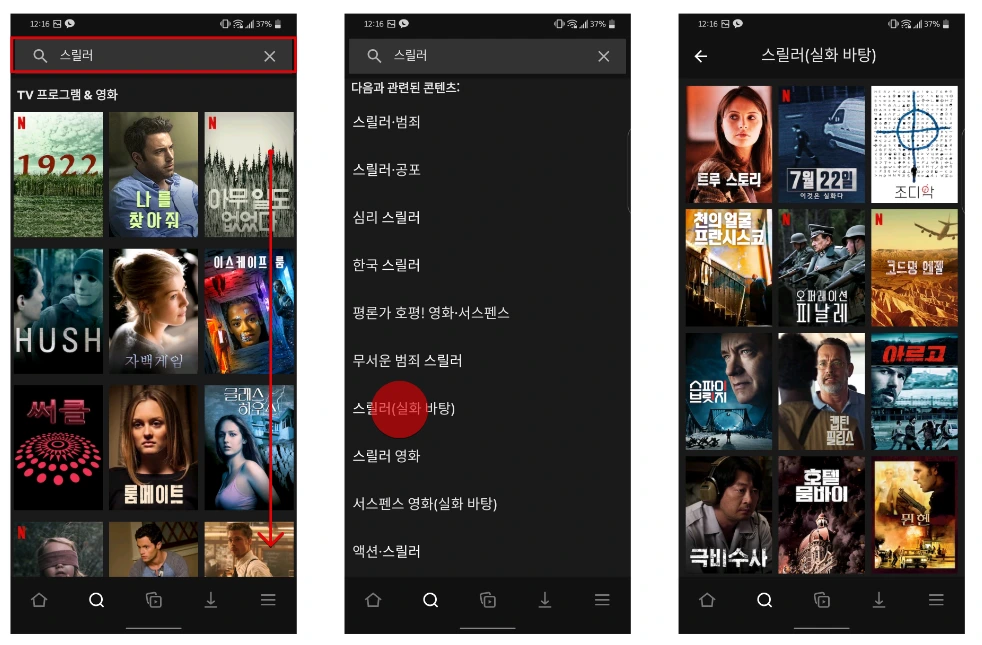 출처: https://www.netflix-codes.com/왓챠 플레이에선 하단 네비게이션 바에 카테고리를 배치해놓았다. 이는 유저가 추천작품 외에도 직접 원하는 장르를 찾아보기 쉽게 하기 위한 것으로 보인다. 넷플릭스에서는 왜 카테고리를 제공하지 않을까 생각해보면, 추천 시스템 고도화를 통해 유저가 탐색하지 않고도 바로 원하는 작품을 볼 수 있는 경험을 완성하기 위한 것으로 보인다. 다만 추천 알고리즘의 콜드 스타드 문제(신규유저의 경우 이전 이력이 없어 적절한 추천이 어려운 문제)를 해소하기 위해선 검색탭에서 최소한의 카테고리를 선택할 수 있는 설정을 마련하는 것이 좋지 않나 싶다.