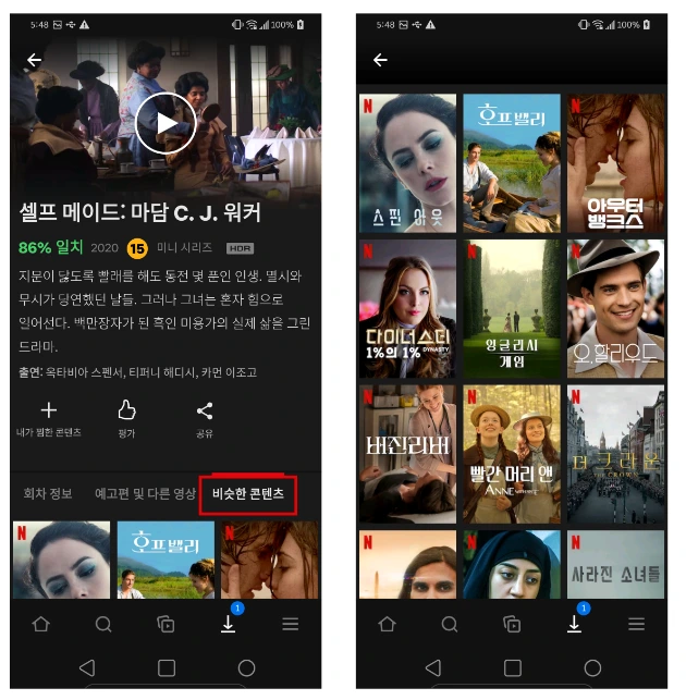넷플릭스는 특정 콘텐츠의 상세페이지에서도 '비슷한 콘텐츠'로 콘텐츠를 추천하고 있다. 필자의 경우 홈화면에 추천된 콘텐츠보다 비슷한 콘텐츠에서 추천된 콘텐츠에 대한 만족도가 높았다. 넷플릭스는 콘텐츠별로 장소와 시대적 배경, 연령층, 주인공 특성 등 태그를 달아 태그 기반으로 유사한 정도를 측정하고 있다. 이에 비슷한 콘텐츠에서 고른 영상은 대체로 기대했던 스토리로 진행되는 경우가 많아 좋았다.