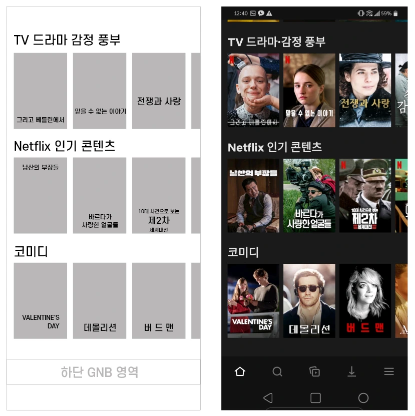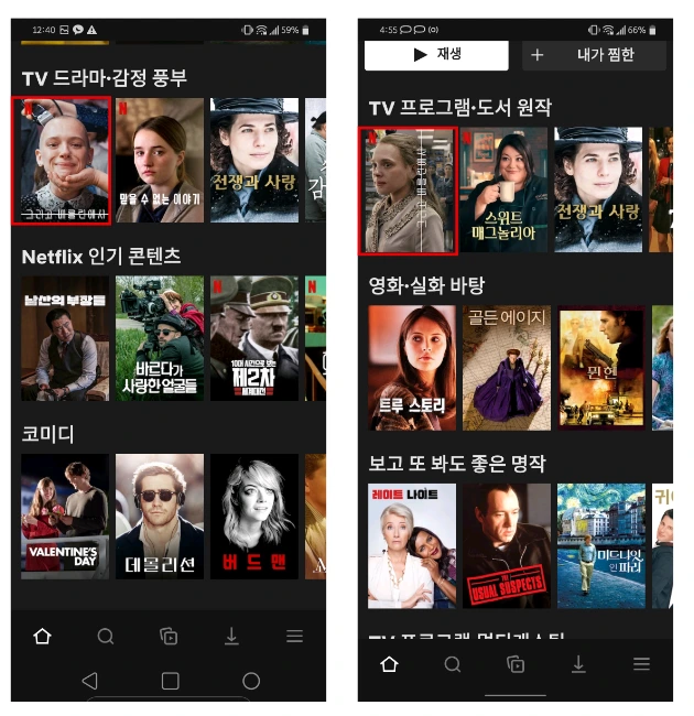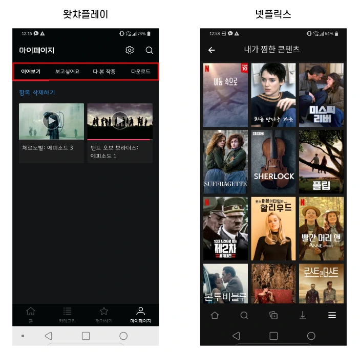 찜한 콘텐츠 UI 비교(왓챠플레이 VS 넷플릭스)
