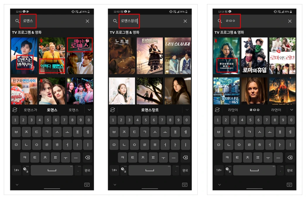 넷플릭스에선 검색유형을 6가지로 제공하고 있다. TV 프로그램 또는 영화 제목, 영화배우, 감독, 장르, 동영상 화질, 언어 등이 그것이다. 검색 필터를 따로 제공하지 않기 때문에 입력한 단어가 둘 이상의 검색유형과 겹칠 경우 무엇을 우선으로 추천해야 할지가 관건일 수 있다. 아래 '로맨스' 검색어와 '로맨스 장르'를 입력했을 때 검색결과는 상이하게 나타났다.
