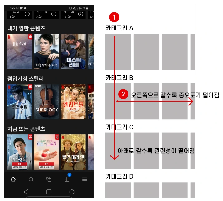 넷플릭스는 페이지 생성 시스템(page generation system)을 통해 홈화면을 완전히 개인화했다. 유저가 홈화면에서 콘텐츠를 탐색할 때 위에서 아래로 스크롤하면서 관심 있는 행(카테고리)을 찾고, 해당 행에 관심 있는 콘텐츠가 있는지 살펴본 후 선택한다. 이런 탐색방식이 직관적이도록 페이지 영역에 정렬해놓음으로써 취향에 맞는 콘텐츠를 찾을 수 있게 돕는 것이다.