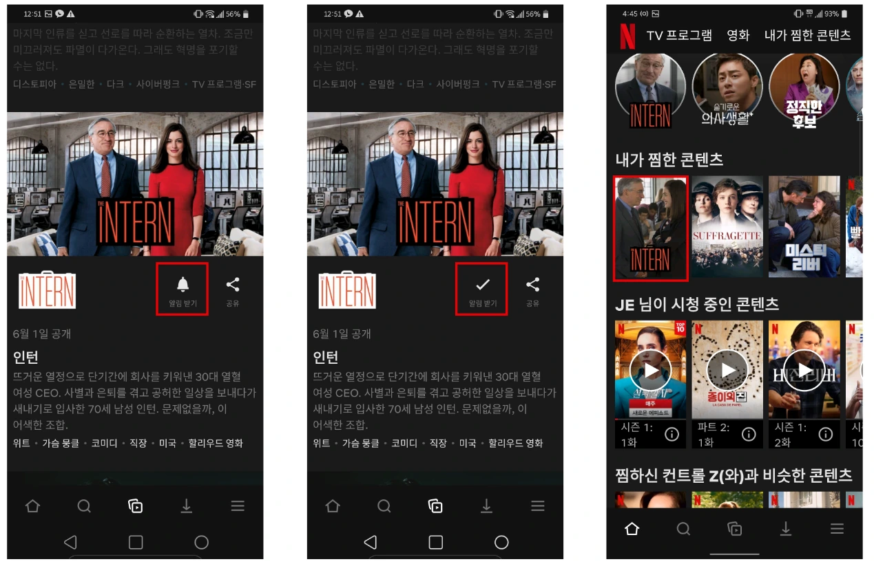 넷플릭스는 다른 OTT 서비스와 달리 향후 업데이트될 콘텐츠를 피드식으로 보여주고 있다. 관심 있는 콘텐츠에 '알림 받기'를 누르면 '찜하기'와 동일한 아이콘으로 바뀐다. 공개 당일에 피드에 있던 콘텐츠는 자동으로 '내가 찜한 콘텐츠'에 이동된다.