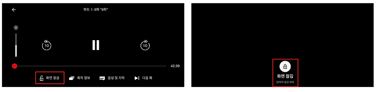 화면 잠금 기능은 생긴 지 얼마 안 됐지만 나올 때부터 유용하게 사용하고 있다. 영상을 보는 중에 무심코 화면을 터치하면 재생 컨트롤이 보여 방해되는 경우가 많은데, 영상을 켜자마자 화면 잠금을 누르면 곧바로 감출 수 있어 좋았다. 특이했던 점은 화면 잠금 상태에서 '오프닝 건너뛰기' 버튼이 눌러지는 것이었다.