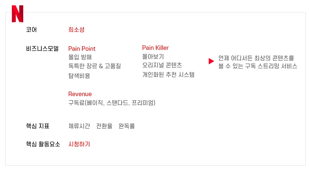 여기서 말하는 '놀랄만한 쇼', '쉬운 선택', '추천' 세 단어를 주목해보면 넷플릭스의 서비스의 핵심은 고품질의 콘텐츠와 개인화된 추천 시스템에 있다는 것을 확인할 수 있다. 넷플릭스는 고품질 콘텐츠를 지속적으로 제공하기 위해 로컬화 된 오리지널 콘텐츠를 직접 제작하고 있으며 넷플릭스에서만 독점적으로 방영한다. 또한 시청기록을 기반으로 한 추천 알고리즘으로 개인화된 홈화면을 제공하고 있다. 이는 타 서비스에서 쉽게 따라잡기 어려운 넷플릭스만의 독특한 가치 즉 '희소성'으로 정의할 수 있다.