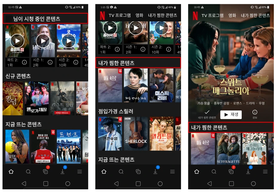 필자는 관심 있는 콘텐츠를 찜하기에 넣어두고 '내가 찜한 콘텐츠 목록'에 있는 콘텐츠를 위주로 봤었다. 원래 이 목록을 설정에서 확인했었는데, 어느 순간 홈화면에 '내가 찜한 콘텐츠'가 보이더니, 최근에는 미리보기 바로 밑으로 이동했다. 목록으로 이동하지 않고도 홈화면에서 콘텐츠를 확인할 수 있어 편리했다.