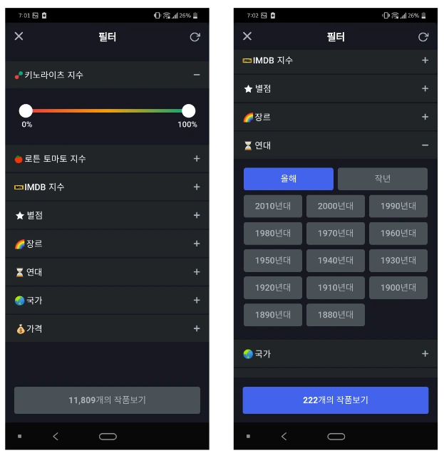 연대를 올해/작년과 연대순으로 보이는 점이 특이하다. 최신 영화를 즐기는 유저와 고전 영화를 즐기는 유저 모두 만족할 수 있는 필터 방식이라 생각한다.