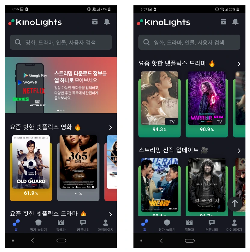 오히려 넷플릭스를 이용하면서 아쉬웠던 포인트만 쏙쏙 가져와 서비스에 담아놨으니 놀랄 노자다. 사용자 수가 충분히 많아져서 OTT 서비스와 딜할 정도가 되면 빠르게 성장할 서비스라 생각한다. 키노라이츠는 신뢰할 수 있는 평점/리뷰와 OTT 서비스 연결 두 가지를 핵심 기능으로 선보였다. 첫 화면을 봤을 때 다음과 같이 이 서비스의 핵심이 잘 나타나고 있다.