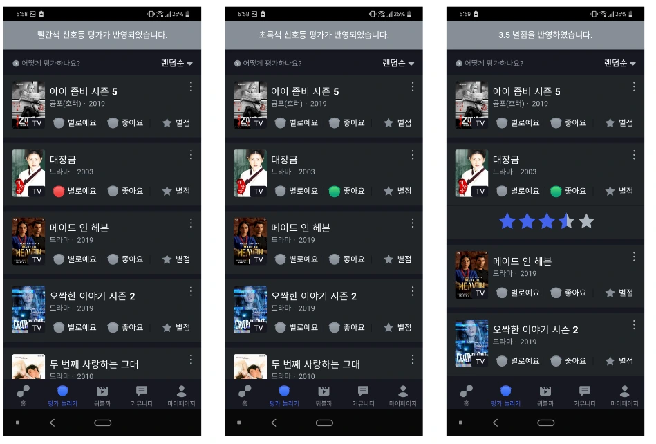 키노라이츠 하단 내비게이션 바에 '평가 늘리기'가 있다. 아직까지 평점과 리뷰가 충분히 모이지 않았기 때문에 접근성을 높인 것으로 보인다. 평점을 매기는 법은 두 가지다. 하나는 넷플릭스처럼 선호도를 반영하는 것, 다른 하나는 별점 1~5점 사이에서 선택하는 것이다. 평점은 보통 선호도나 별점 중 하나만 보여주기 마련인데 두 가지를 전부 보여주는 점이 특이했다.