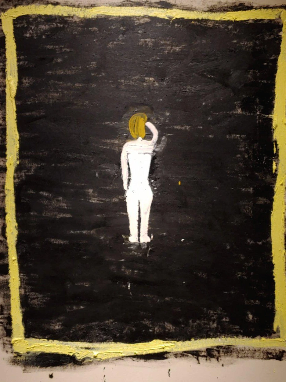 오른쪽 작품은 로즈 와일리가 키우는 검은 고양이 피트이다. 그림은 피트가 날아가는 새를 쳐다보는 모습을 보여준다. 이 작품은 2020년에 그려졌다는 배경을 이해하고 갈색 테두리를 주목해보자. 올해는 코로나 19로 많은 이들이 집 안에서 주로 생활해야만 했다. 밖을 돌아다니지 못하는 제약 속에 살아가는 우리를 생각하며 로즈 와일리는 갈색 창틀 밖으로 보이는 고양이를 그렸다. 뒷모습이지만 튀어나올듯한 눈알을 옆에 그려넣음으로써 고양이가 새를 호기심 어리게 쭉 지켜보고 있다는 재밌는 상상을 하게 만든다.
