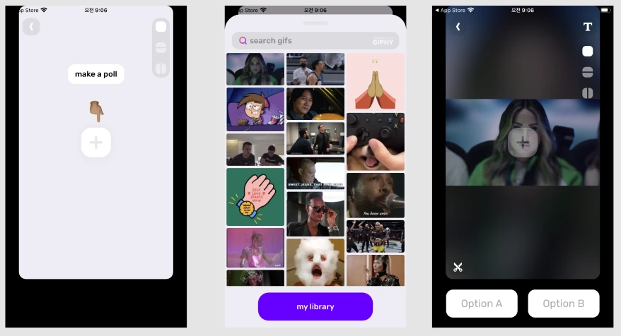 NewNew는 투표라는 콘텐츠를 재밌게 만들 수 있는 도구를 제공하고 있어요. 투표의 뒷 배경은 Giphy API를 이용해 재밌는 Gif를 선택할 수 있고, 인스타그램 스토리처럼 텍스트, 옵션, 효과 등으로 꾸밀 수 있어요.