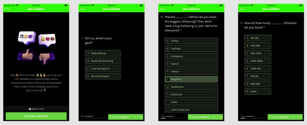 NewNew는 아무나 콘텐츠를 만들 수 없고 신청절차를 밟아야 해요. 신청하기 전 설문조사를 받는데, 이런 설문조사를 통해 NewNew가 어떻게 프로덕트 마켓 핏을 찾으려는지 알 수 있어요. NewNew는 수익 + 팔로워 + 재미 세 가지를 담은 플랫폼이고, 경쟁사로 기존 SNS(인스타그램, 페이스북 등) 포함 구독 서비스(Substack, OnlyFans 등)를 보고 있어요. 그리고 어느 정도의 팔로워를 가진 사람이 NewNew를 필요로 하는지도 설문조사를 통해 알려고 하네요!