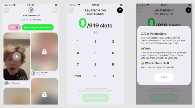 NewNew는 투표를 하려면 일정 금액을 지불해야 합니다. 콘텐츠는 1개만 보여주고 나머지는 자물쇠로 잠긴 상태로 보여주는데요. 금액을 지불하면 나머지 콘텐츠도 볼 수 있습니다. 흥미로웠던 점은 구매한 Slots만큼 기능에도 차등을 두는 점입니다. 가령, 5개 slots을 구매하면 한 번 투표할 때 5개를 투표하는 것과 같은 가치를 매깁니다.