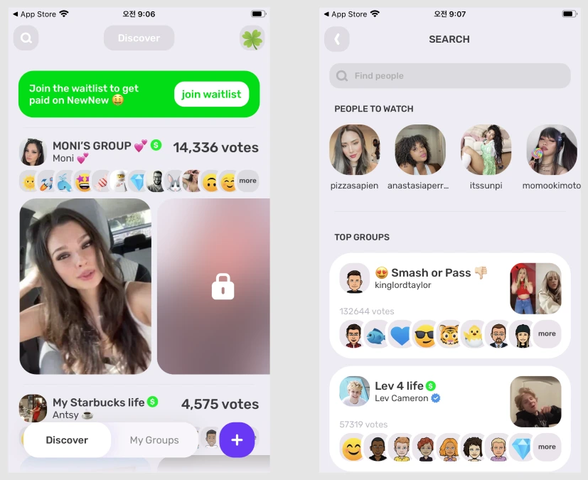 NewNew 또한 틱톡의 형태와 유사합니다. 콘텐츠를 탐색할 수 있는 Discover 탭과 내가 팔로우한 사람의 콘텐츠를 모아볼 수 있는 My Groups 탭으로 구분하고 있어요. 검색에서는 인기 있는 계정과 가장 많이 투표를 얻은 콘텐츠를 보여주고 있어요. Bandlab 글에서도 언급했지만 사용자에게 좋은 콘텐츠를 노출하는 것이 서비스 인상을 좌우하기 때문에 중요합니다.
