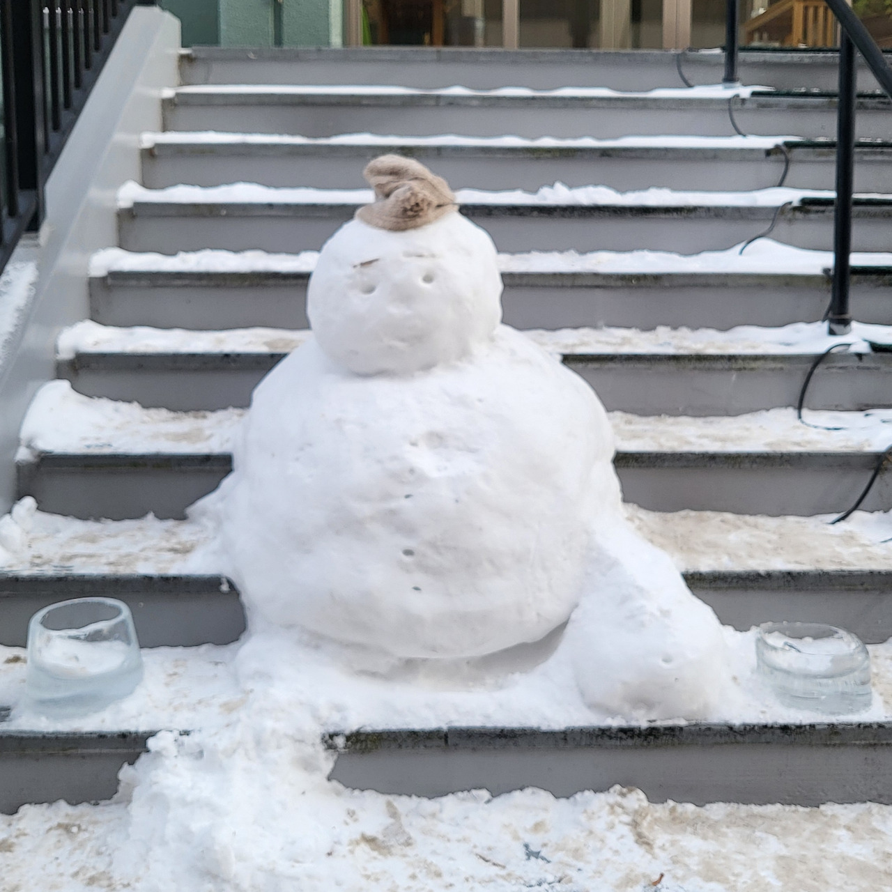 혹시나 해서 구글지도를 확인하니 큰길로 둘러서 가면 오유누마까지 들어갈 수 있을 법도 해서도보로 쭉 따라 걸었다. 주변엔 신식 호텔과 오래된 료칸이 한 곳에 나란히 있어 묘한 인상을 받았다. 한 호텔 앞에는 거대한 눈사람이 계단 위에 놓여 있었다. 조금 억울한 표정을 한 눈사람은 지나가는 관광객의 눈길을 붙잡아 포토존으로 변신한다.