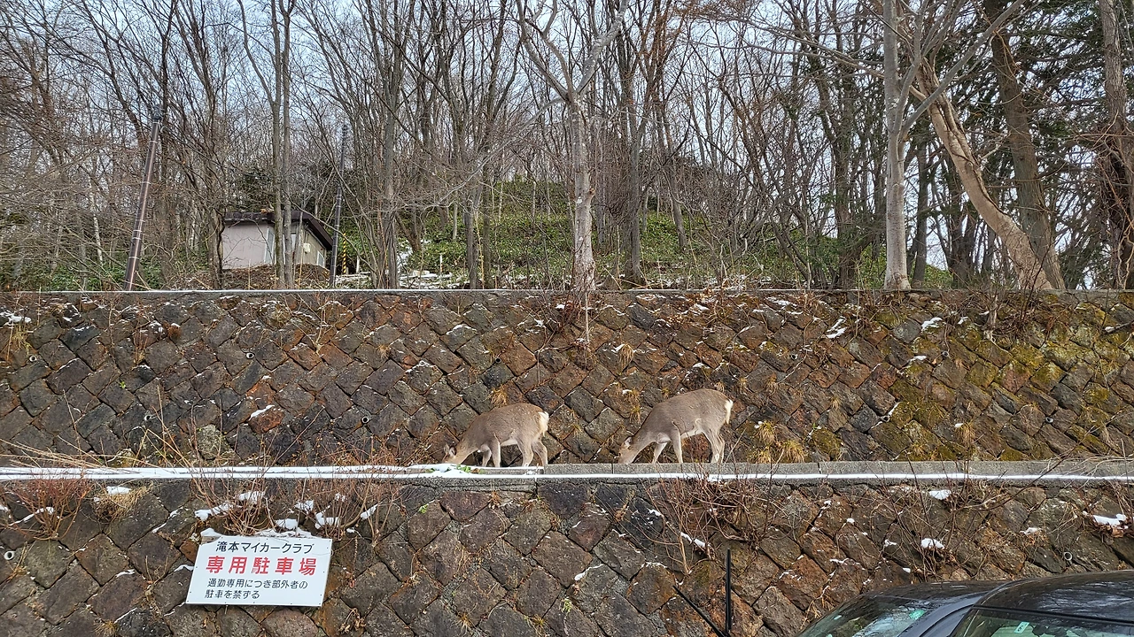 혹시 나가 역시나였던가. 이곳에서도 오유누마 가는 길은 통제되고 있었다. 잠시 몰래라도 다녀올까 싶었지만, 일말의 양심과 만일의 안전을 생각하며 조용히 돌아섰다. 왔던 길을 돌아가면서 뜻밖의 생물을 만났다. 지옥계곡에서 먼발치에서만 봤던 사슴이었다. 사슴 두 마리는 천연덕스럽게 마을에 내려와 풀을 씹고 있었다. 설레는 마음으로 그 모습을 사진에 담았다.
