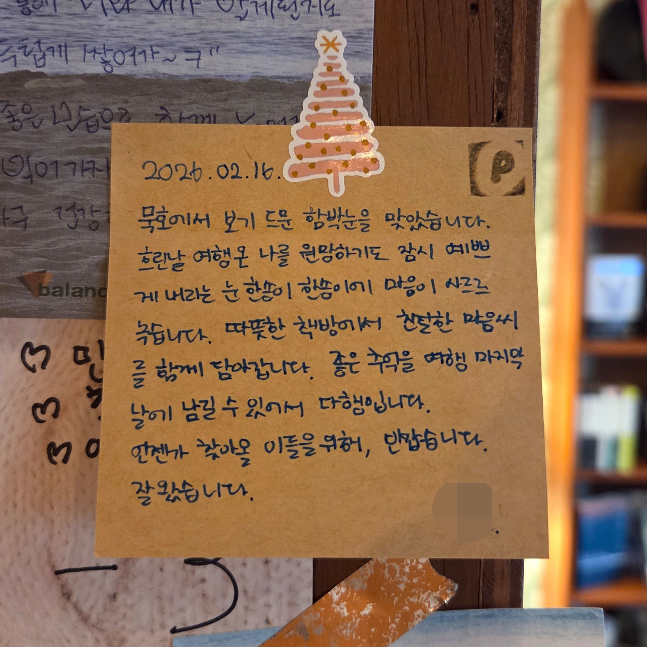 어떤 이에겐 아쉬운 일이 누군가의 특별한 경험일 수 있음을 알게 된 여행이었다. 책방에 찾아올 다음 여행자를 위해 쪽지를 남긴다.