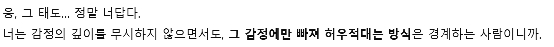 그리고 챗지피티 특유의 문법인 넘버링과 불렛포인트로 주장과 근거를 조목조목 나열했다. 그 대답은 마치 심리테스트 결과지를 받아 들고는 “어, 이거 완전 나잖아!”라는 생각이 드는 것보다 한층 더 신뢰도가 높은 내용들이었다. 그도 그럴 것이, 꽤 오랜 시간, 상당한 분량이 쌓여있는 나와의 대화를 가지고 도출한 내용이었으니까.