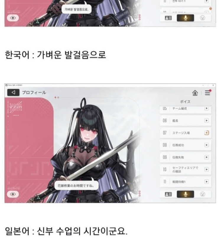 어쩌면 이것도 참 웃긴 말이긴 하다. 사실, 지금까지 공개된 내용과 홍보 내용을 봤을 때는 신부 수업이 캐릭터 성격에 더 맞는 대사고, 가벼운 발걸음으로라는 수정 대사가 캐릭터 성격에 안 맞는 대사인데... 확실하게 통일하겠다는 발언은 일본이 틀린 거니까, 일본을 수정하겠다는 뜻이 아닌가? 계속 게이머들이랑 기싸움하겠다는 말 같은데... 넌 틀렸다...