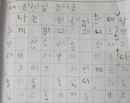 먹기 싫은 음식을 바닥에 버리던 그 아이가 질문을 한다. 그럼 저는요? 아~ 짱구는 건강하라고 정성껏 만들어주신 음식을 바닥에 버리는 어린이라고.... 아직 안 적었어. 선생님이 여러번 알려주고 기다려준다고 했잖아. 정훈이는 이제 그런 행동을 안할거라고 믿고 있어. 아직은 안 적었지만 자꾸만 선생님 몰래 그런 행동을 하면 나중에는 적게 되겠지. 이 아이도 안도하는 한숨을 쉰다.
