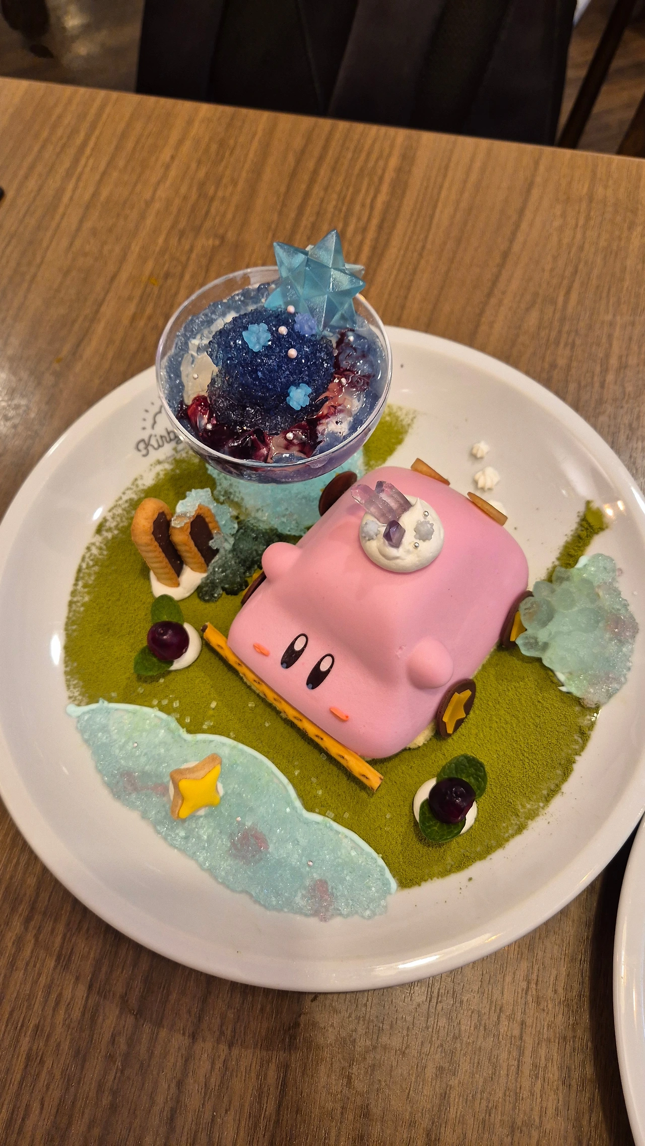 식당안으로 안내를 받기전에 주문 설명을 해주는데 식사메뉴중 품절상품을 알려주고, 디저트메뉴중 커비가 자동차를 집어삼킨 모습의 케이크은 1팀당 1개만 주문이 가능하다고 한다.