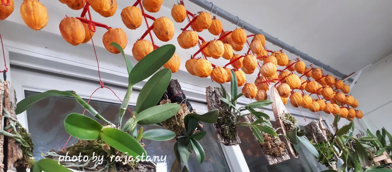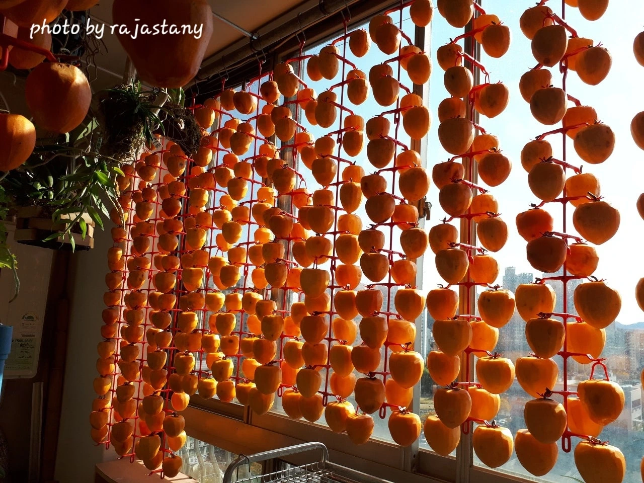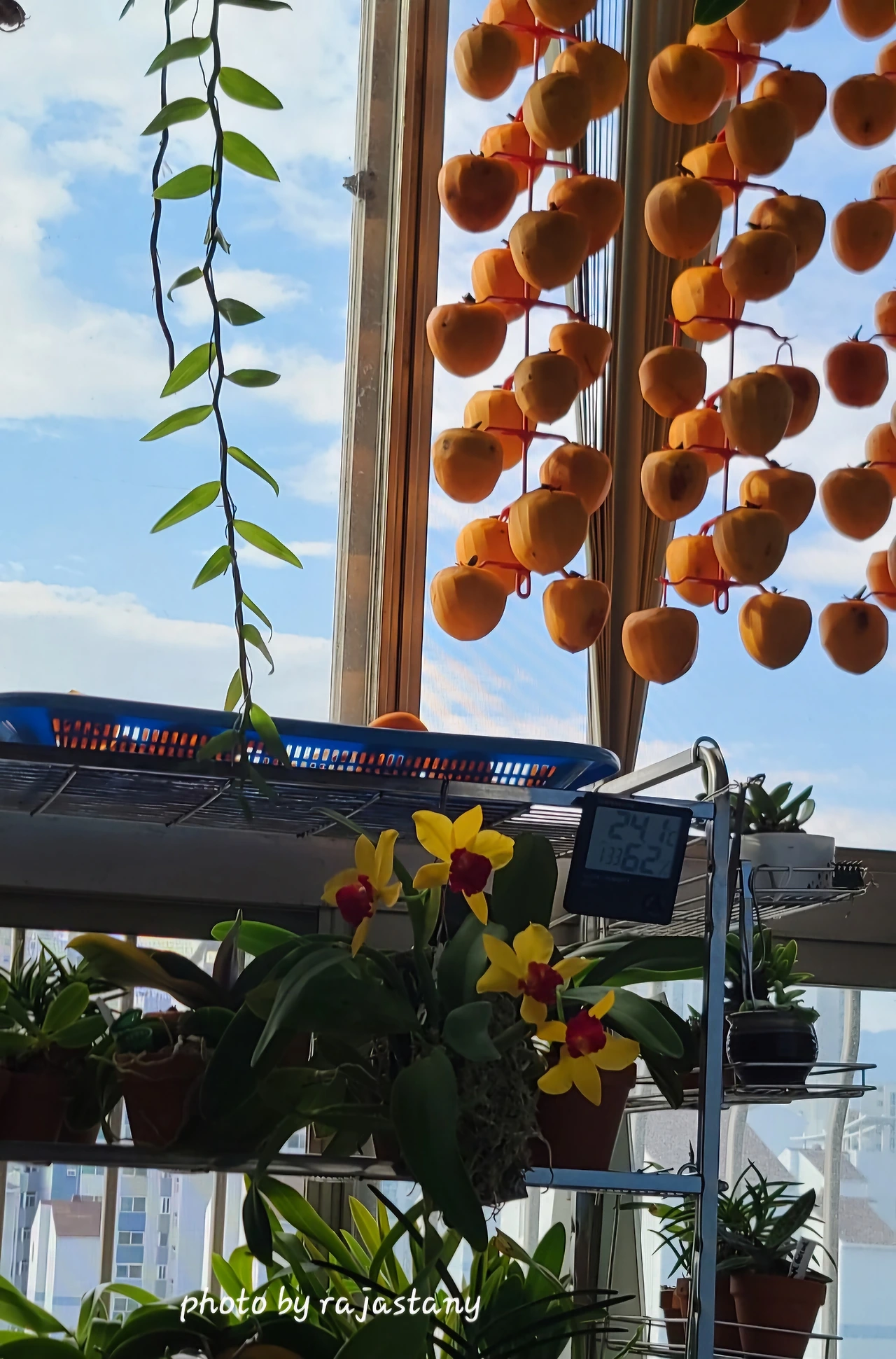 주황색 곶감이 난초와 함께 꽃처럼 피어나는 가을 베란다 풍경이다.