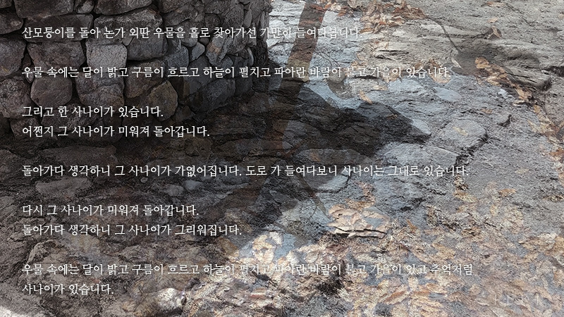 다만 상황은 바뀐 것이 없다. 우물 속에는 미워했었던 그 얼굴이 그대로 있다. 잠시 뒤로 물러났던 미움이 다시 전면에 자리를 잡는다. 미워졌으니 떠난다. 미워서 떠나는 것일 수도 있지만 더 미워하지 않기 위해 떠나는 것이기도 하다. 미움이 밀어냈는데 막상 떠나니 그리움에 사로잡힌다. 아 정말, 가슴 아픈 반복이다. 수많은 사랑 중에서 이렇게 미움이 섞인 사랑이 가장 어려운 것 같다.