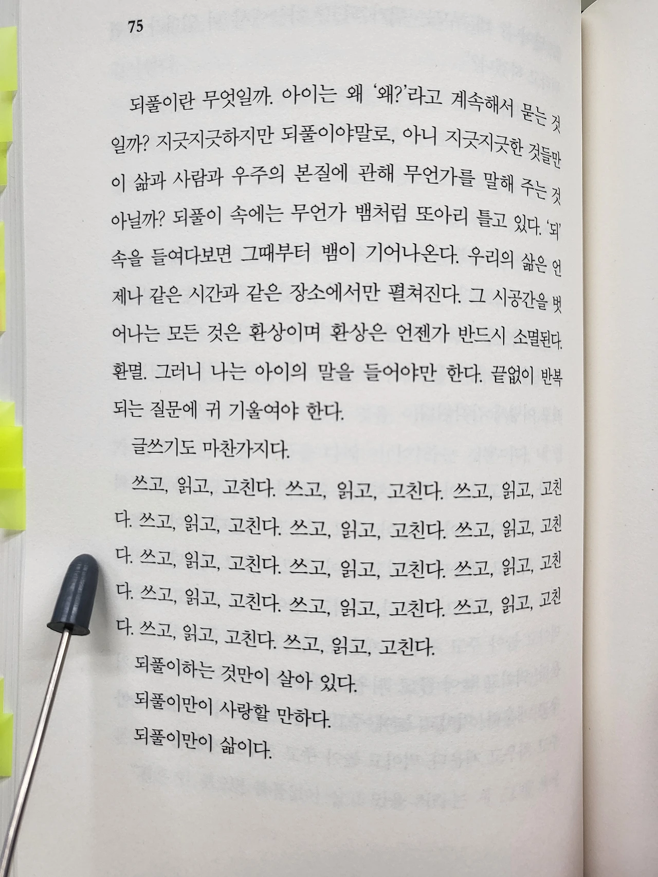 먹이고 놀아주고 치우고 재우는 하루. 그렇게 되풀이로 감각되는 하루를 글 쓰는 이도 느낀다. 비로소 내가 여기에 와 있구나 실감이 든다. 아무도 주목하지 않는 첫 책을 쓰고 두 번째 책을 써보려 끙끙대는 '책 낸 사람'. 문지혁 작가님이 베이스캠프에 남기고 간 흔적 같다. 내가 여기 머물던 흔적을 남기고 가니, 너도 여기까지 왔다면 이 낙서를 보게 될 거라고.