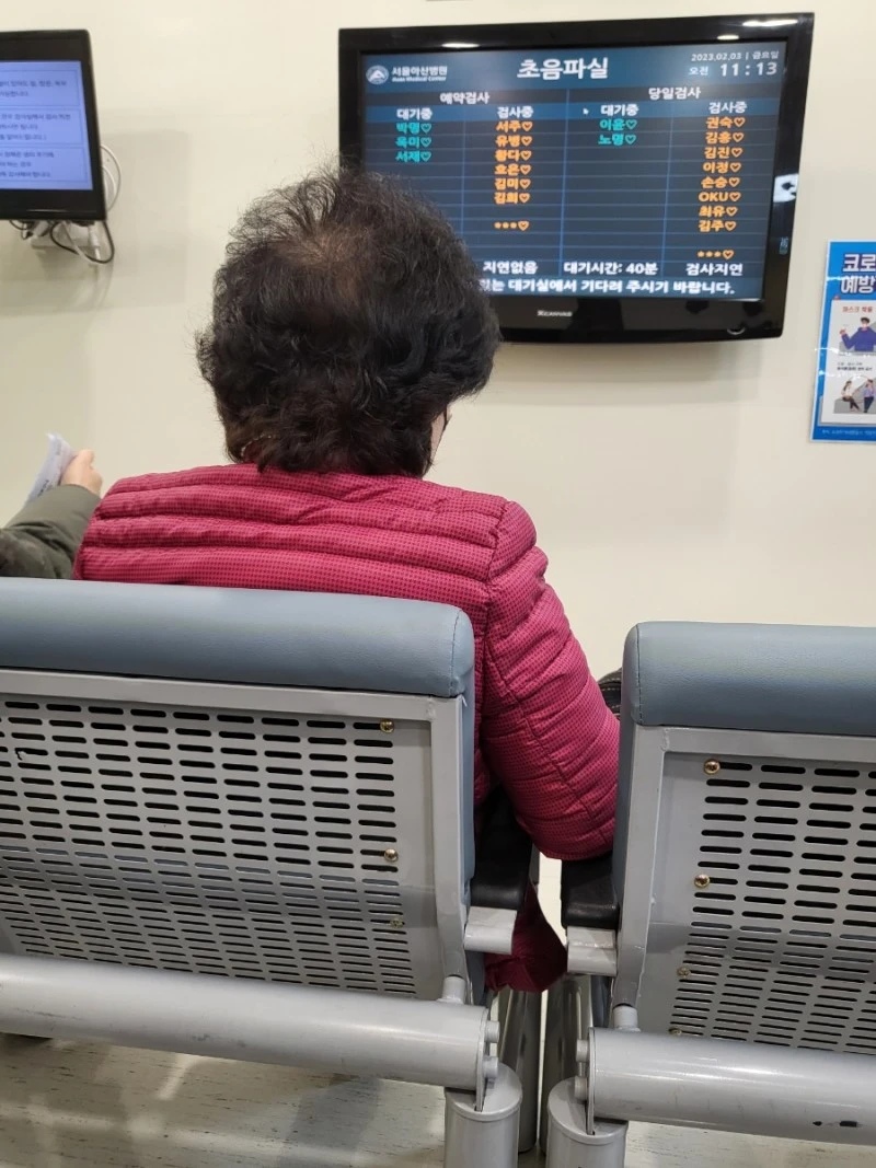 신경외과를 거쳐 산부인과에서 초음파를 한 번 더 했다. 뇌에 있는 꽈리도 문제없단다. 수술할 수 있단다. 뒤늦게 어머니의 몸 구석구석이 궁금했다. 골다공증이며 연골주사며, 다행히 수술과 관련된 건 없지만 걱정이 앞선다.