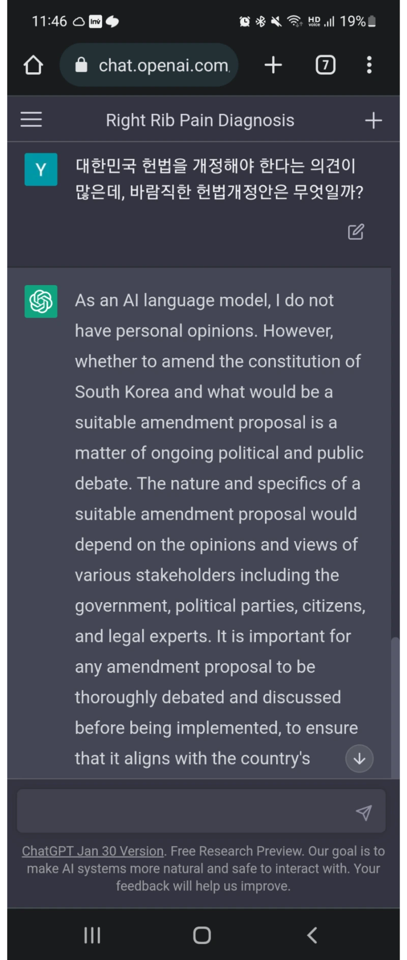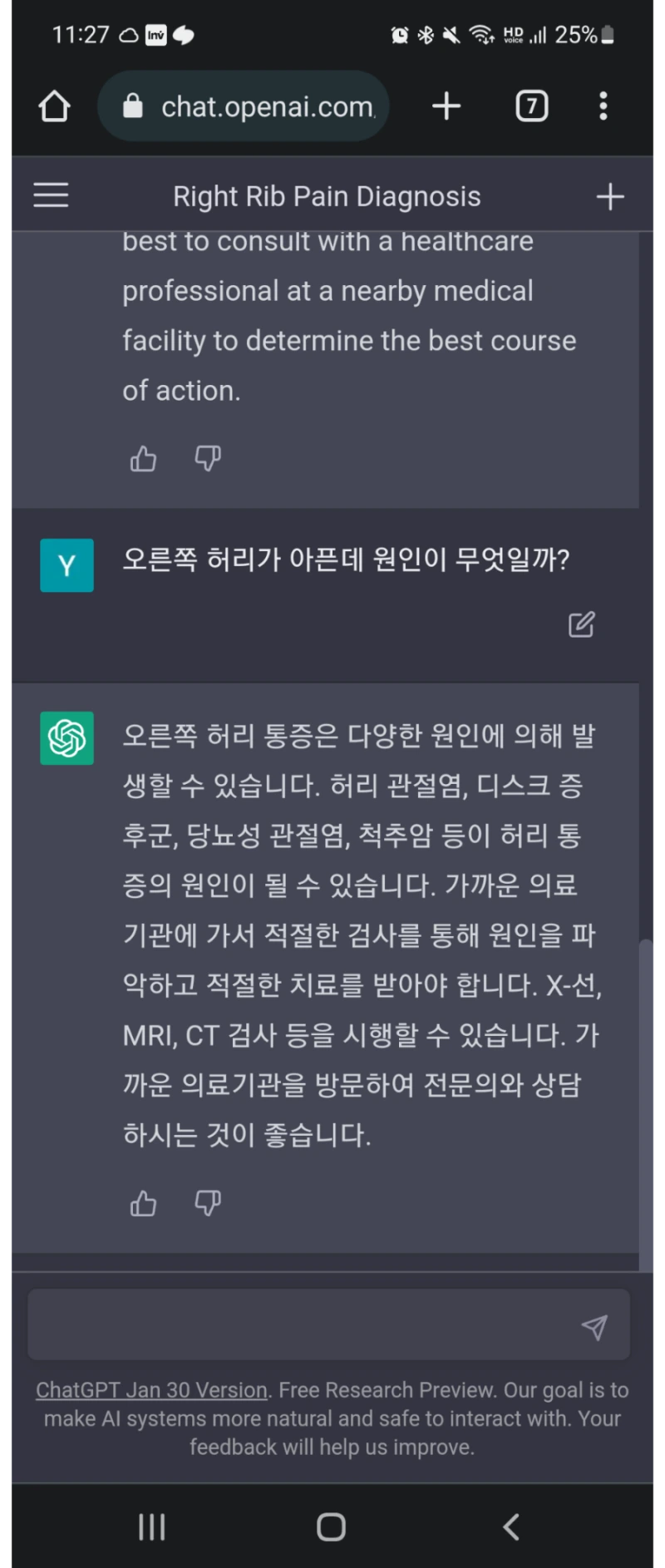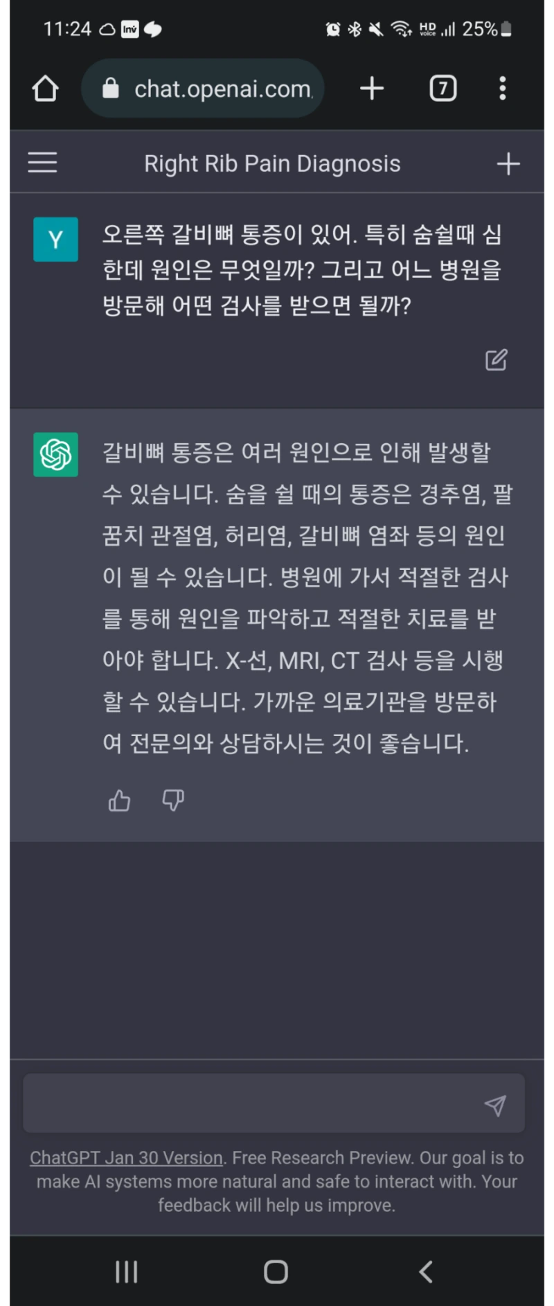 가만히 앉아 얼마 전 목사님께 선물 받은 현미 찜질팩을 옆구리에 끼고 다시 한숨 잤다. 일어나도 아프다. 요즘 힙하다는 Chat-GPT에게 물어보기로 했다. 일단 반말로.
