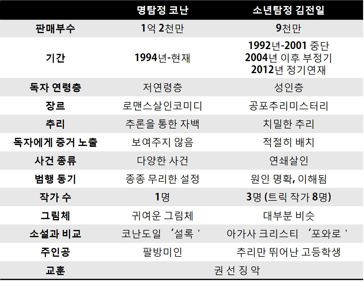 코난이 김전일에 비해 독자층이 넓고 꾸준히 연재해온 덕에 더욱 높은 인기를 가지고 있는 것은 사실이지만, 추리 마니아층 독자를 가지고 있는 것은 김전일이라고 할 수 있습니다.
