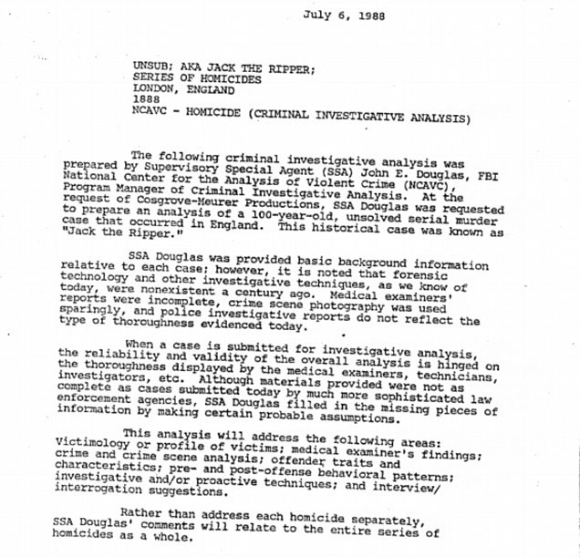 *100년이나 뒤늦게(2011년) 공개한 위 보고서는 Jack the Ripper 가 '외톨이, 얼굴에 상처가 있음, 언어장애'와 같은 특징을 가지고 있었다는 것을 분석했다 (관련 기사: 'Loner, scarred face, speech problems': FBI dossier reveals chilling profile of Jack the Ripper... shame it was released 100 years too late).