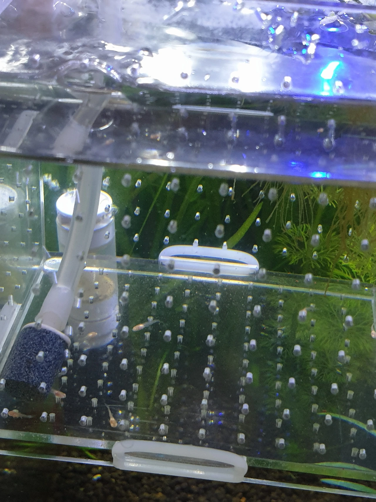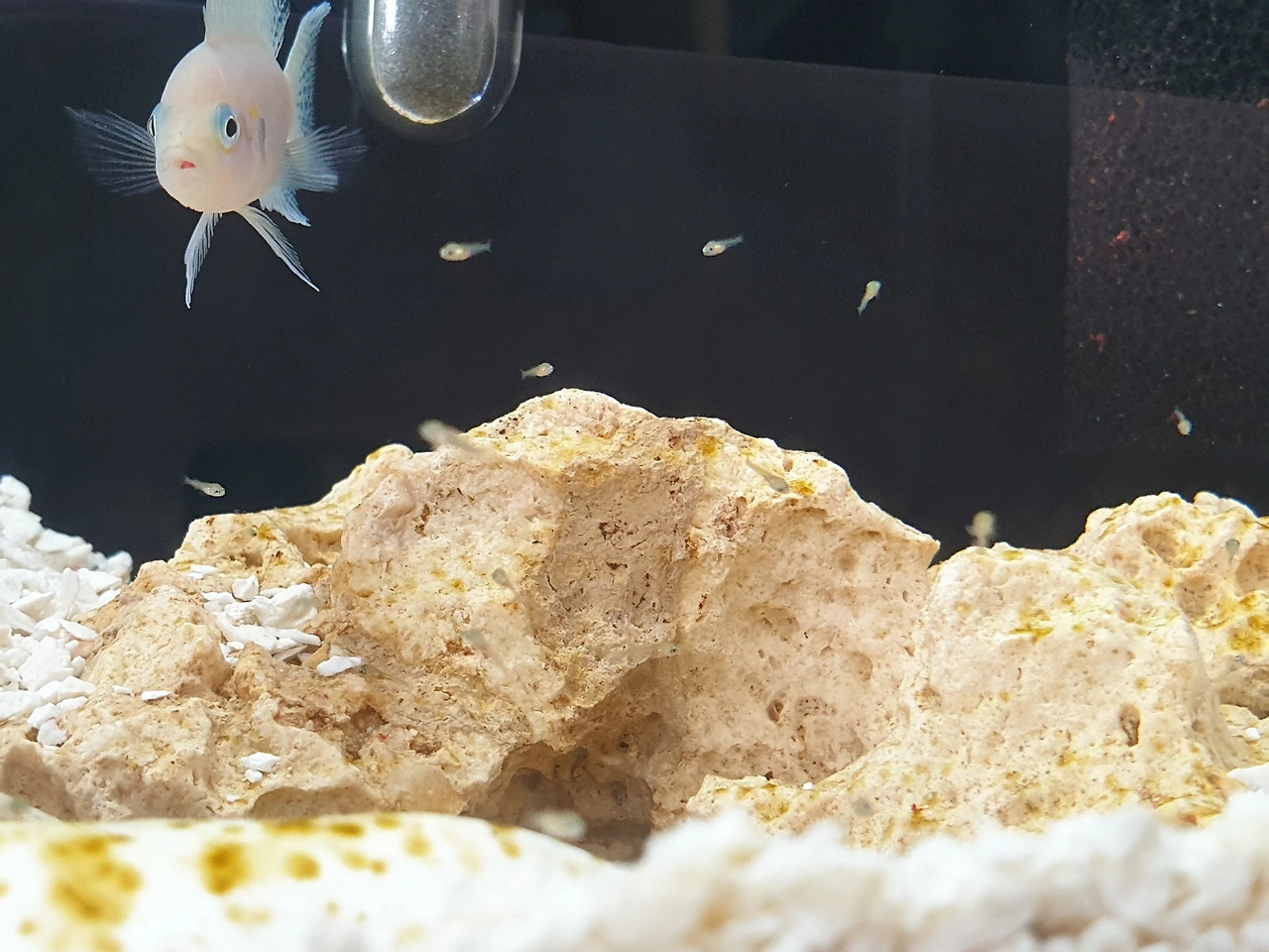 다음날 아침, 생각지도 못하게 구피가 새끼를 낳았다. 작디작은 생명체가 아픈 어미몸속에서 건강하게 나왔다. 아직은 너무 작아 새끼가 병에 걸렸는지는 알 수 없지만 이 와중에 태어난 새끼구피들이 참 대견했다. 태어난 새끼구피는 모두 열두 마리였고, 한 마리는 결국 태어나서 꼬리가 붙은 채로 죽어버렸다.