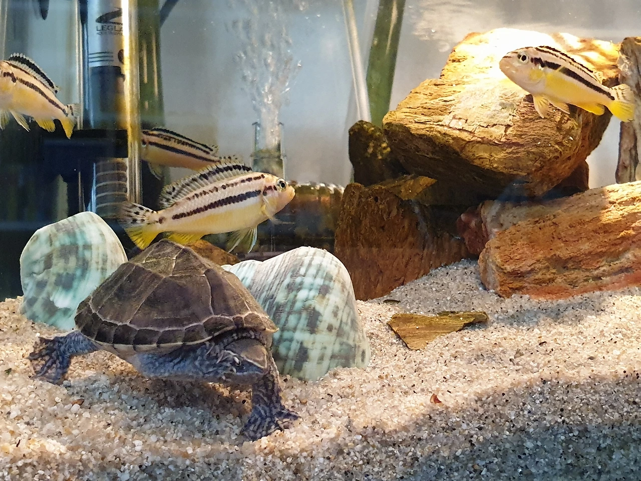 거북이와 함께 사는 시클리드 중 욕심 많고 힘이 센 한 마리는 매번 거북이 밥을 뺏어먹더니 결국 돼지물고기가 되었다. 볼 때마다 우습다. 그 큰 거북이밥을 우걱우걱 씹는 모습이 놀랍기도 하고 재미있기도 해서 이제는 물고기밥을 주지 않고 거북이 밥을 준다. 작은 시클리드도 빨리 크라고 거북이밥을 던져주면 결국 욕심 많은 돼지시클리드가 다 먹어 해치운다. 어쩔 수 없는 적자생존의 어항 속 세상이다. 성체물고기든 새끼물고기든 힘이 센 물고기만 더 잘 먹고 더 클 수밖에 없다. 작은 물고기가 좀 불쌍하고 안타깝긴 하지만 내가 도와주는 것도 한계가 있다. 약한 물고기에게 직접 먹이를 주고 싶지만 물고기들은 거북이와 달라서 개별적으로 챙겨주기가 힘들다.